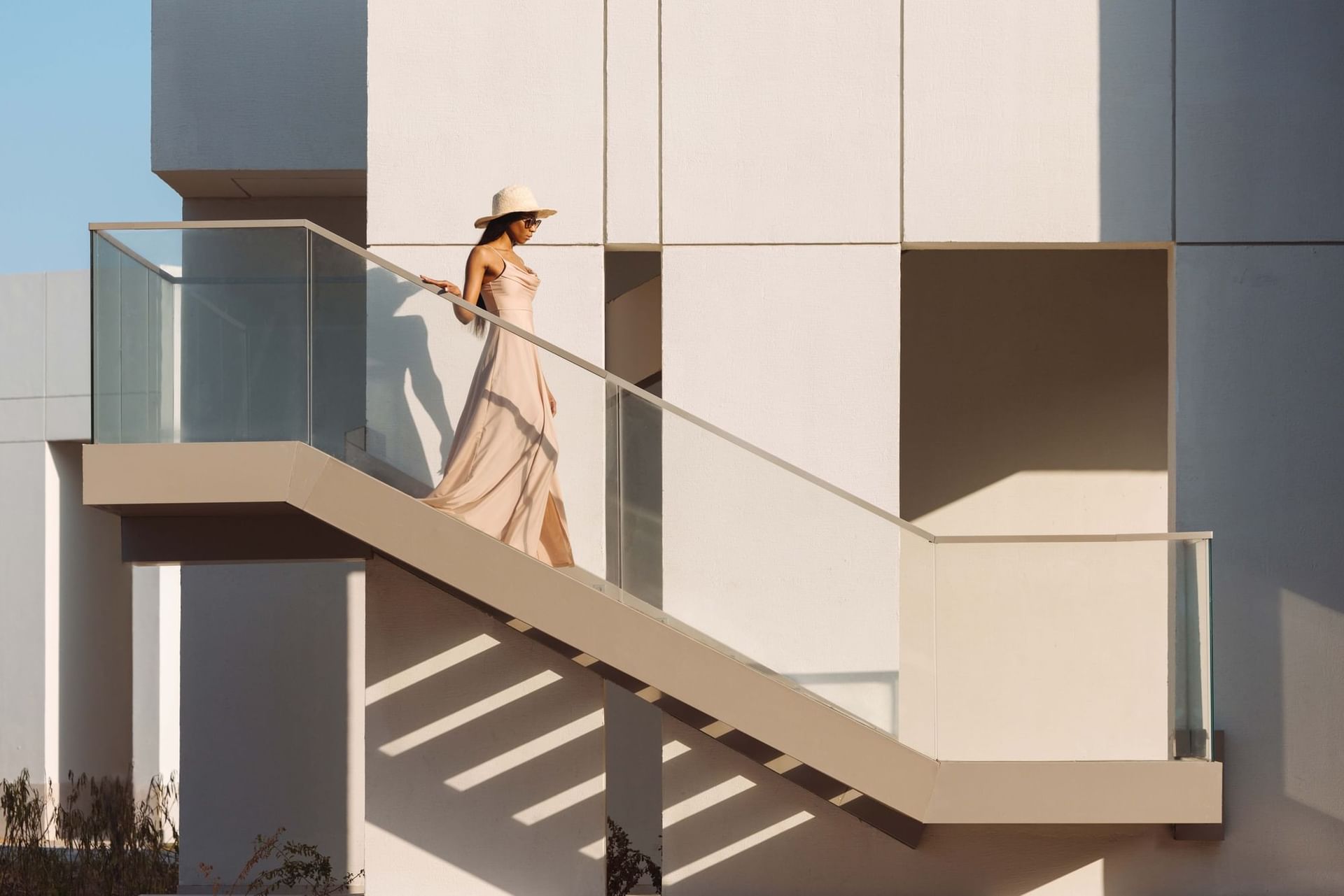 Machen Sie einen gemütlichen Spaziergang entlang des 500 Meter langen privaten, weißen Sandstrand, einem der schönsten Strände in den VAE.